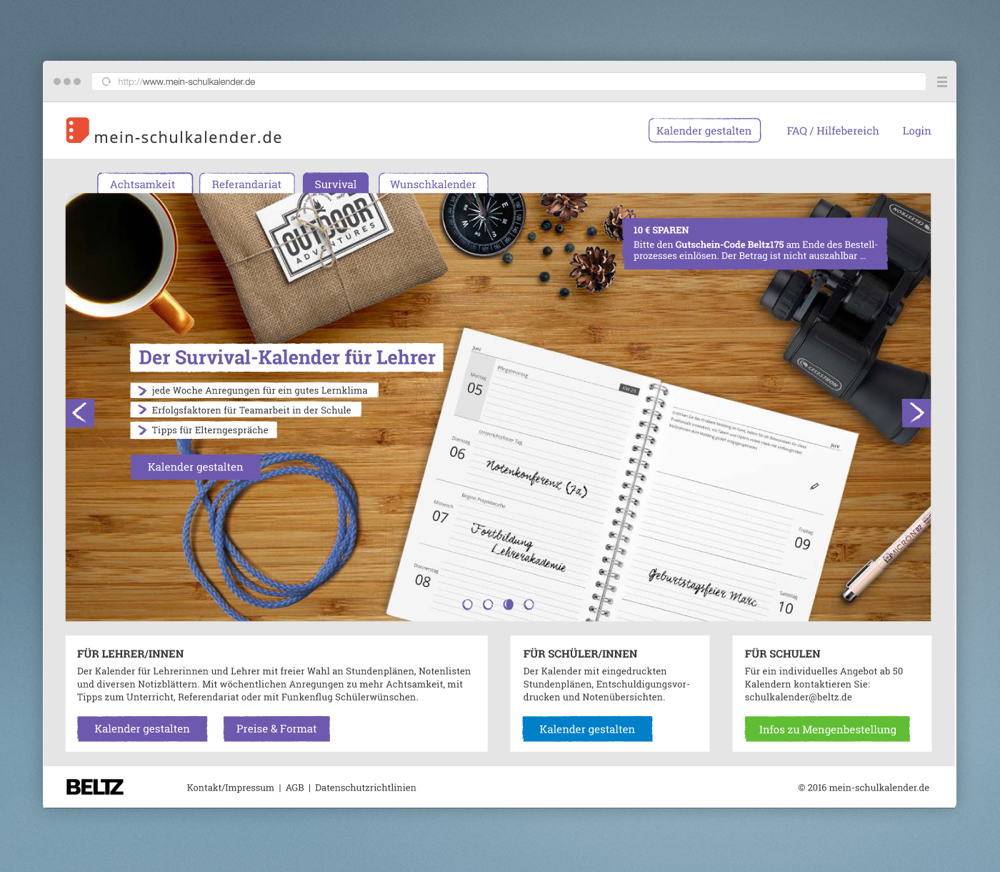 Mein Schulkalender ist ein Angebot des Beltz Verlags, einen individuellen Kalender zu gestalten. Die Zielgruppen sind hauptsächlich Lehrer, Schüler und Schulen. Jede dieser Zielgruppen hat eine eigene Landingpage, die sich mit Hilfe der Farben voneinander abhebt.